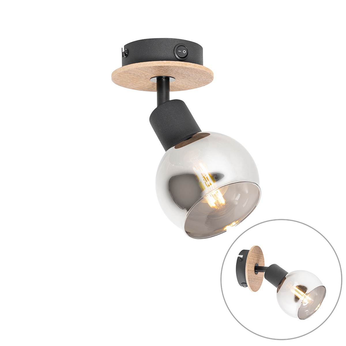 Art Deco spot zwart met smoke glas en hout – Vidro