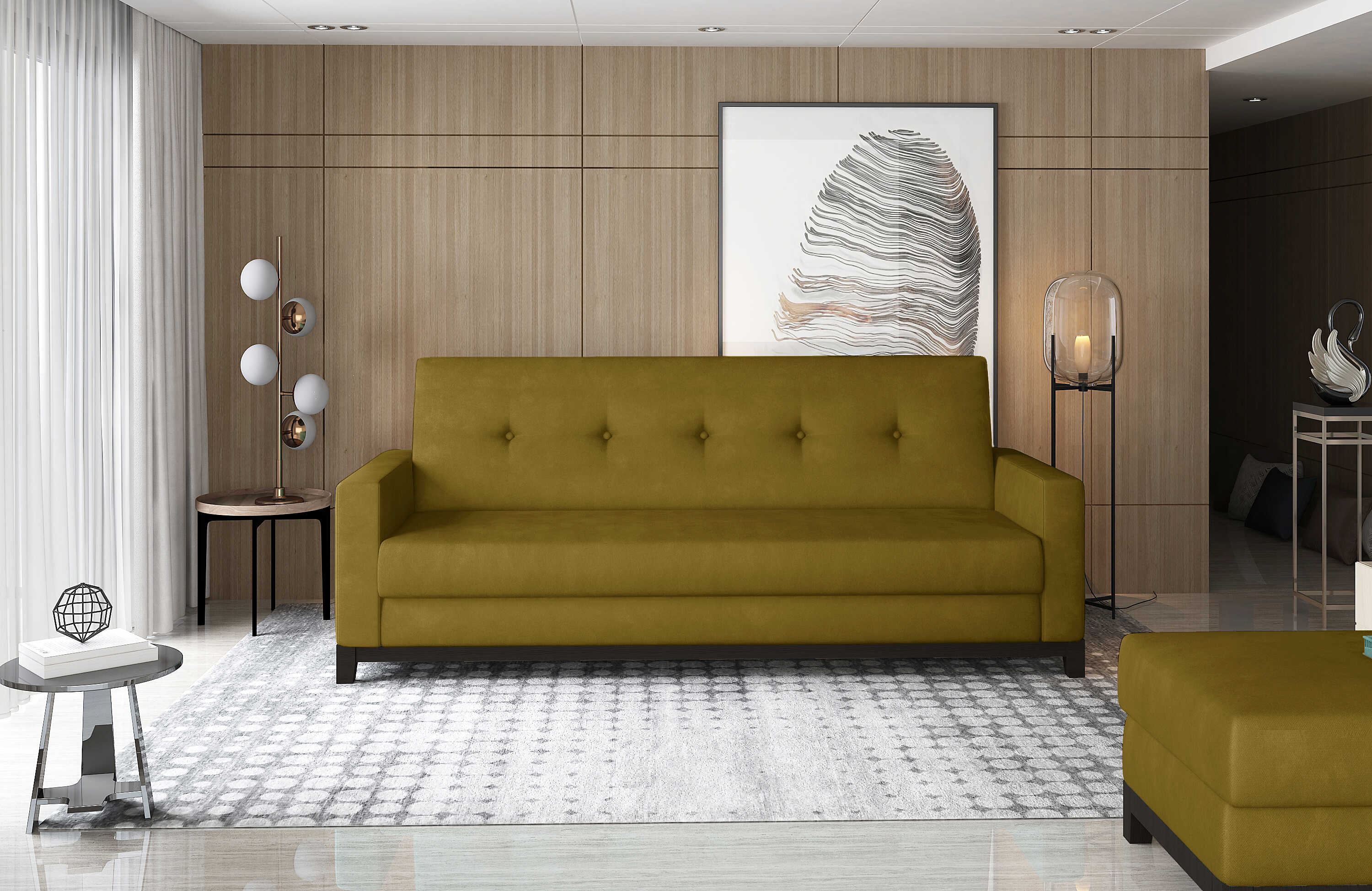 Jednoduchá pohovka SELENE sa vďaka čistým líniám a jemným detailom hodí do akéhokoľvek štýlu interiéru. Moderný dizajn podčiarkuje prešívanie na operadle. Ozdobné gombíky sú v rovnakej farbe ako látka pohovky, vďaka čomu pôsobí pohovka SELENE veľmi konzistentne. Vzhľad pohovky je doplnený o drevené nohy, vyrobené z masívu, s možnosťou výberu buk alebo orech. Pohovka je rozkladacia a rovnako poskytuje aj úložný priestor. Spacia plocha o rozmere 195 x 110 cm. K pohovke je možné doobjednať taburetku SELENE v rovnakom prevedení.