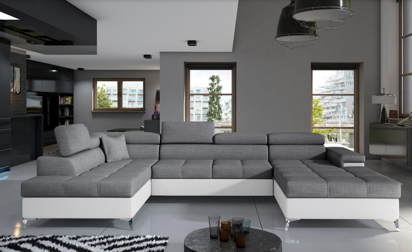 Vytvorte si z obývacej izby atraktívny priestor s dizajnovou sedacou súpravou EDUARDO v tvare U. Vďaka vyšším nohám z chrómovej ocele pôsobí konštrukcia sedačky odľahčene, pričom však nestráca na stabilite. Mimoriadny dizajn dodáva pohovke pútavé prešívanie sedenia, komfort užívania zvyšuje možnosť polohovania hlavovej opierky. Vďaka čalúnenej zadnej strane je vhodná aj do priestoru. Veľkým plusom je úložný priestor a možnosť rozloženia na spanie, vďaka veľmi intuitívnemu systému delfín bude ľahké získať miesto na spanie s plochou až 125 x 265 cm. Spravte si z obývacej izby harmonický a zladený celok vďaka originálnej sedačke EDUARDO v ľavom prevedení.
