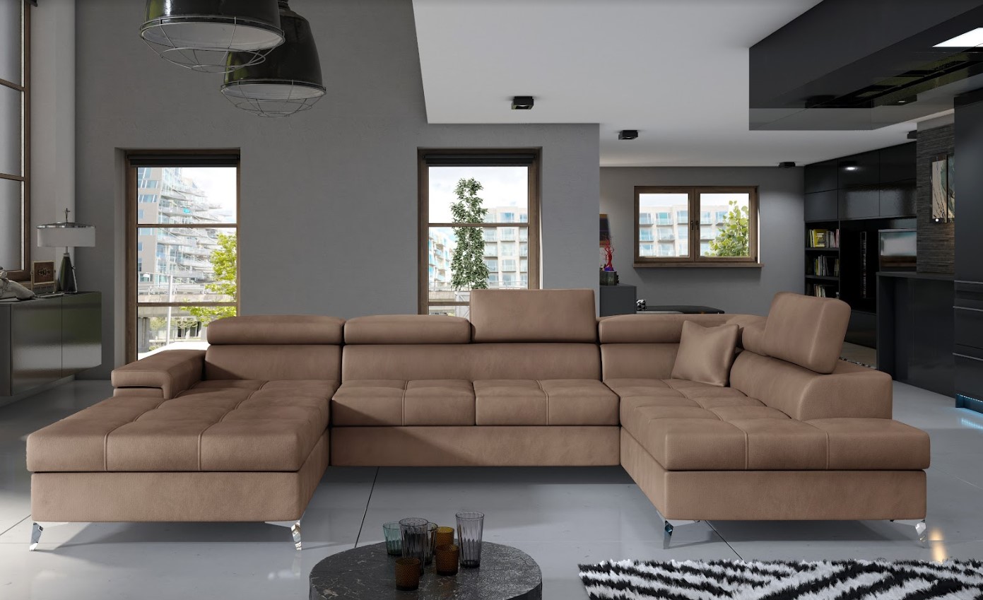 Vytvorte si z obývacej izby atraktívny priestor s dizajnovou sedacou súpravou v tvare U. Vďaka vyšším nohám z chrómovej ocele pôsobí konštrukcia sedačky odľahčene, pričom však nestráca na stabilite. Mimoriadny dizajn dodáva pohovke pútavé prešívanie sedenia, komfort užívania zvyšuje možnosť polohovania hlavovej opierky. Vďaka čalúnenej zadnej strane je vhodná aj do priestoru. Veľkým plusom je úložný priestor a možnosť rozloženia na spanie, vďaka veľmi intuitívnemu systému delfín bude ľahké získať miesto na spanie s plochou až 125 x 265 cm. Spravte si z obývacej izby harmonický a zladený celok vďaka originálnej sedačke RICARDO v pravom prevedení.