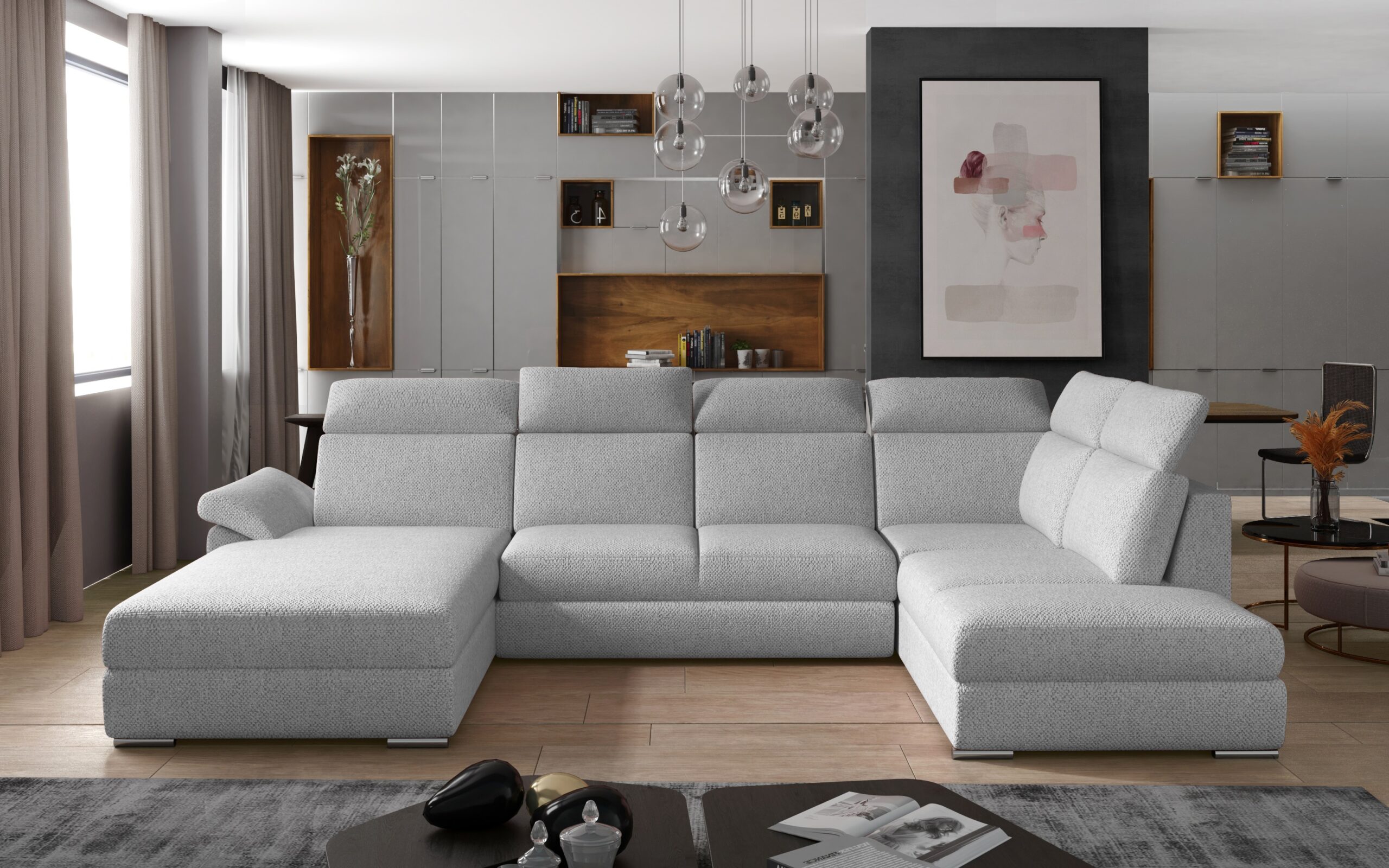 Priestranná a pohodlná rozkladacia rohová súprava do U EVANELL znázorňuje výraznú dominantu modernej obývačky. EVANELL je komfortná sedacia súprava v tvare U. Je možné ju jednoducho rozložiť. Po rozložení dostanete priestrannú plochu na spanie o rozmeroch 125 x 265 cm, ktorá poteší aj tých najnáročnejších používateľov. Sedacia súprava EVANELL je vyrobená z kvalitných pružín a pružnej peny. Funkčnosť sedacej súpravy zvyšuje aj dostatočne veľký úložný priestor.
