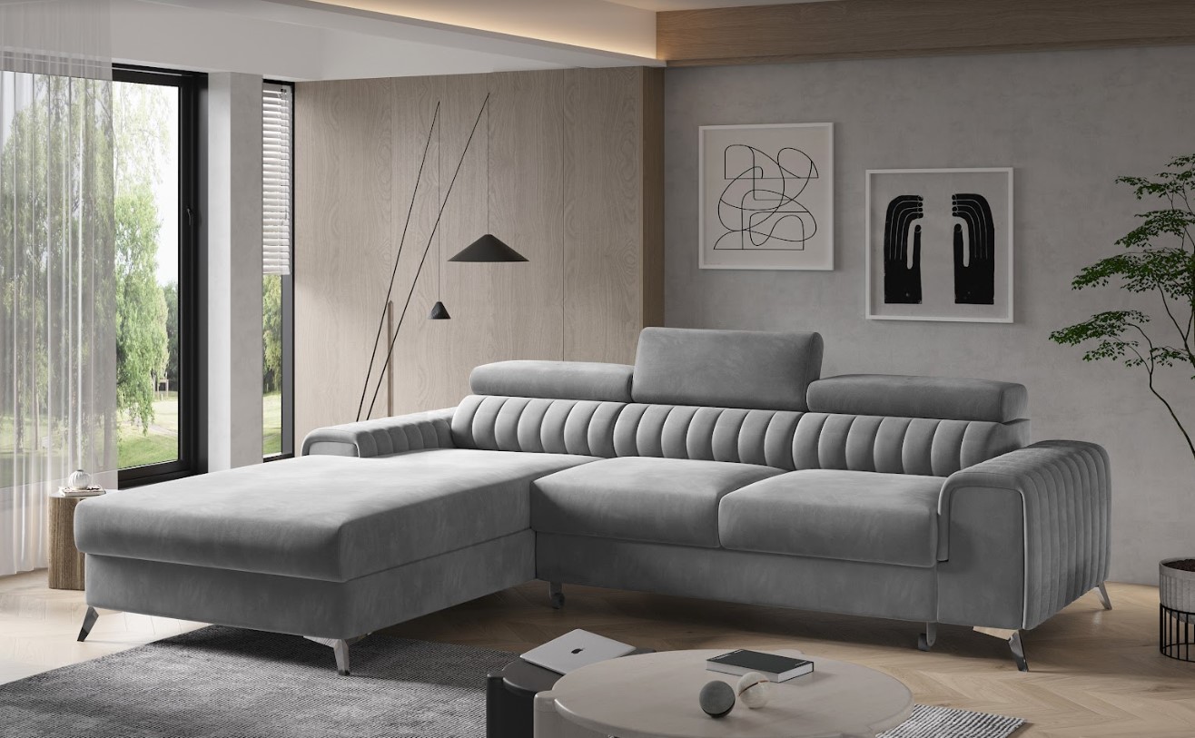 Vytvorte si z obývacej izby atraktívny priestor s dizajnovou rohovou sedacou súpravou GRAYSON v ľavom prevedení. Vďaka vyšším nohám z ocele pôsobí konštrukcia sedačky odľahčene, pričom však nestráca na stabilite. Mimoriadny dizajn dodáva pohovke pútavé prešívanie na operadle a podrúčkach, vďaka čalúnenej zadnej strane je vhodná aj do priestoru. Oceníte veľký úložný priestor a vybavenie rozkladacou funkciou na spanie, založenou na veľmi intuitívnom systéme delfín – vďaka ktorému bude ľahké získať miesto na spanie s rozlohou až 125 x 210 cm. Spravte si z obývacej izby harmonický a zladený celok vďaka originálnej sedačke GRAYSON.
