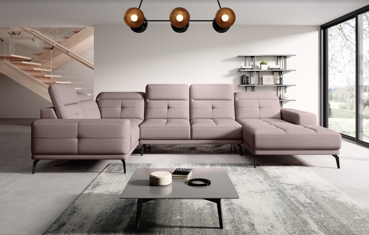 Vytvorte si z obývacej izby atraktívny priestor s dizajnovou sedacou súpravou NEVIRO v tvare U. Vďaka vysokým čiernym nohám pôsobí konštrukcia sedačky odľahčene, pričom však nestráca na stabilite. Mimoriadny dizajn dodáva pohovke ozdobné prešívanie na celej ploche sedenia a komfort užívania zvyšuje možnosť polohovania hlavovej opierky. Vďaka čalúnenej zadnej strane je vhodná aj do priestoru. Spravte si z obývacej izby harmonický a zladený celok vďaka originálnej sedačke NEVIRO v ľavom prevedení.
