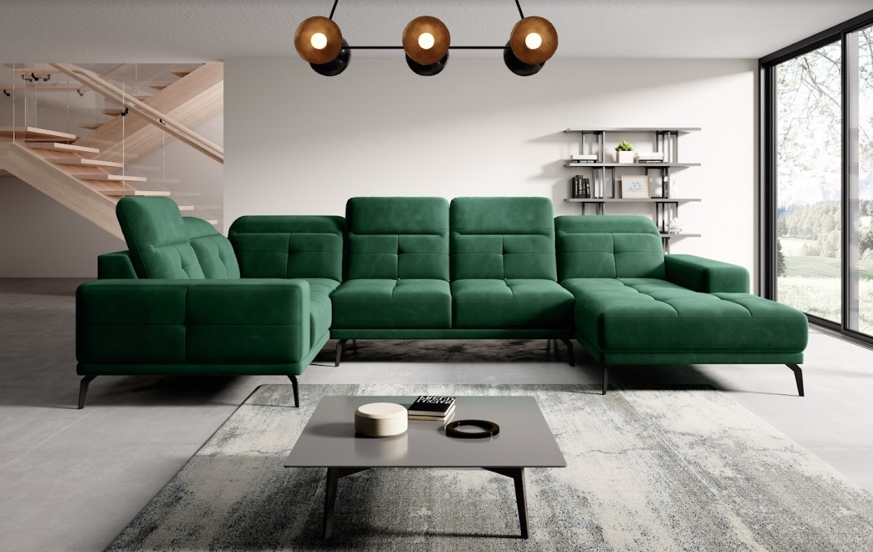 Vytvorte si z obývacej izby atraktívny priestor s dizajnovou sedacou súpravou NEVIRO v tvare U. Vďaka vysokým čiernym nohám pôsobí konštrukcia sedačky odľahčene, pričom však nestráca na stabilite. Mimoriadny dizajn dodáva pohovke ozdobné prešívanie na celej ploche sedenia a komfort užívania zvyšuje možnosť polohovania hlavovej opierky. Vďaka čalúnenej zadnej strane je vhodná aj do priestoru. Spravte si z obývacej izby harmonický a zladený celok vďaka originálnej sedačke NEVIRO v ľavom prevedení.