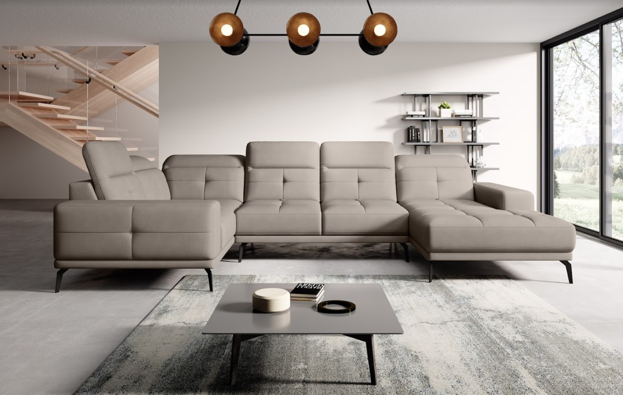 Vytvorte si z obývacej izby atraktívny priestor s dizajnovou sedacou súpravou NEVIRO v tvare U. Vďaka vysokým čiernym nohám pôsobí konštrukcia sedačky odľahčene, pričom však nestráca na stabilite. Mimoriadny dizajn dodáva pohovke ozdobné prešívanie na celej ploche sedenia a komfort užívania zvyšuje možnosť polohovania hlavovej opierky. Vďaka čalúnenej zadnej strane je vhodná aj do priestoru. Spravte si z obývacej izby harmonický a zladený celok vďaka originálnej sedačke NEVIRO v ľavom prevedení.