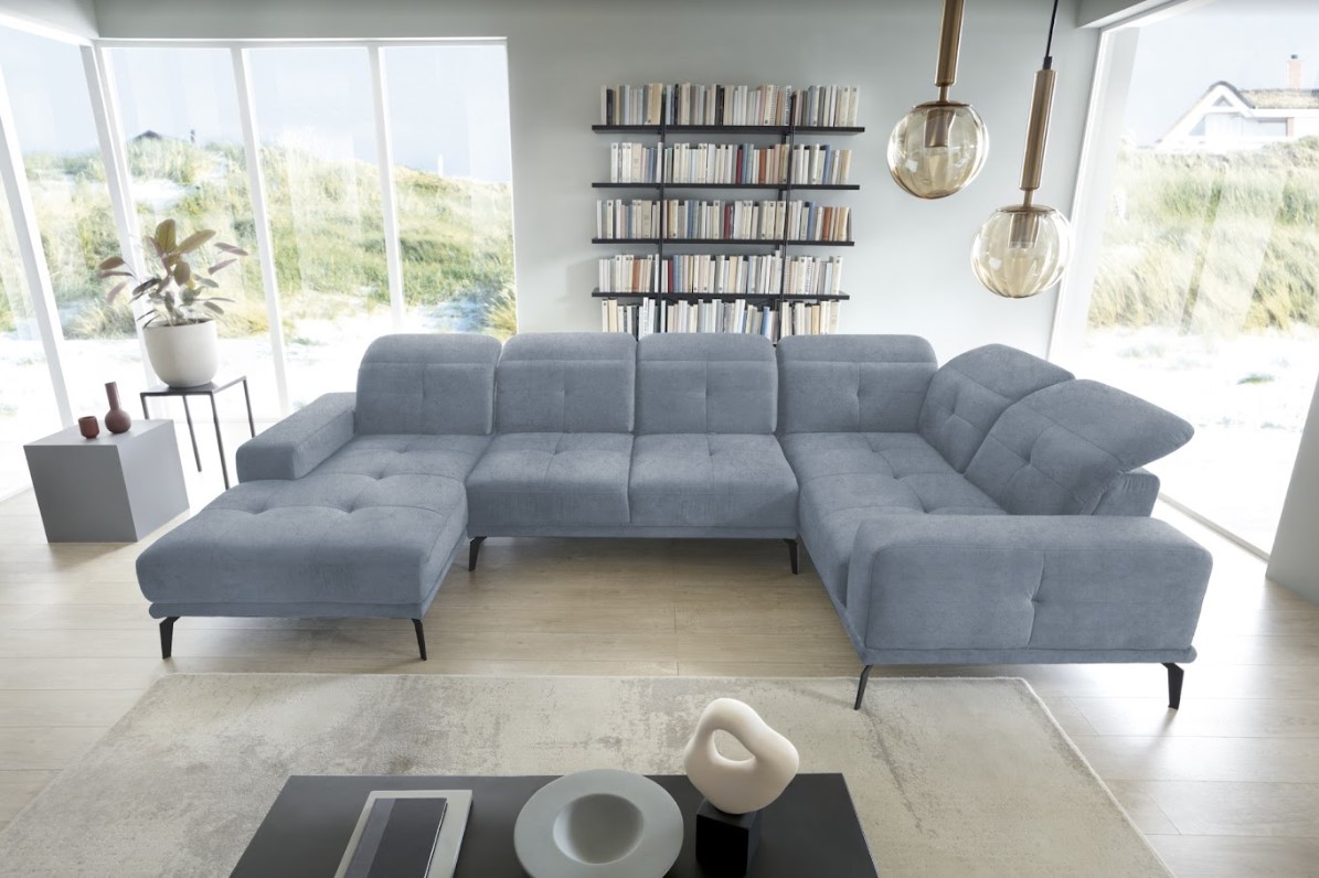 Vytvorte si z obývacej izby atraktívny priestor s dizajnovou sedacou súpravou v tvare U. Vďaka vysokým čiernym nohám pôsobí konštrukcia sedačky odľahčene, pričom však nestráca na stabilite. Mimoriadny dizajn dodáva pohovke ozdobné prešívanie na celej ploche sedenia a komfort užívania zvyšuje možnosť polohovania hlavovej opierky. Vďaka čalúnenej zadnej strane je vhodná aj do priestoru. Spravte si z obývacej izby harmonický a zladený celok vďaka originálnej sedačke NEVIRO v pravom prevedení.