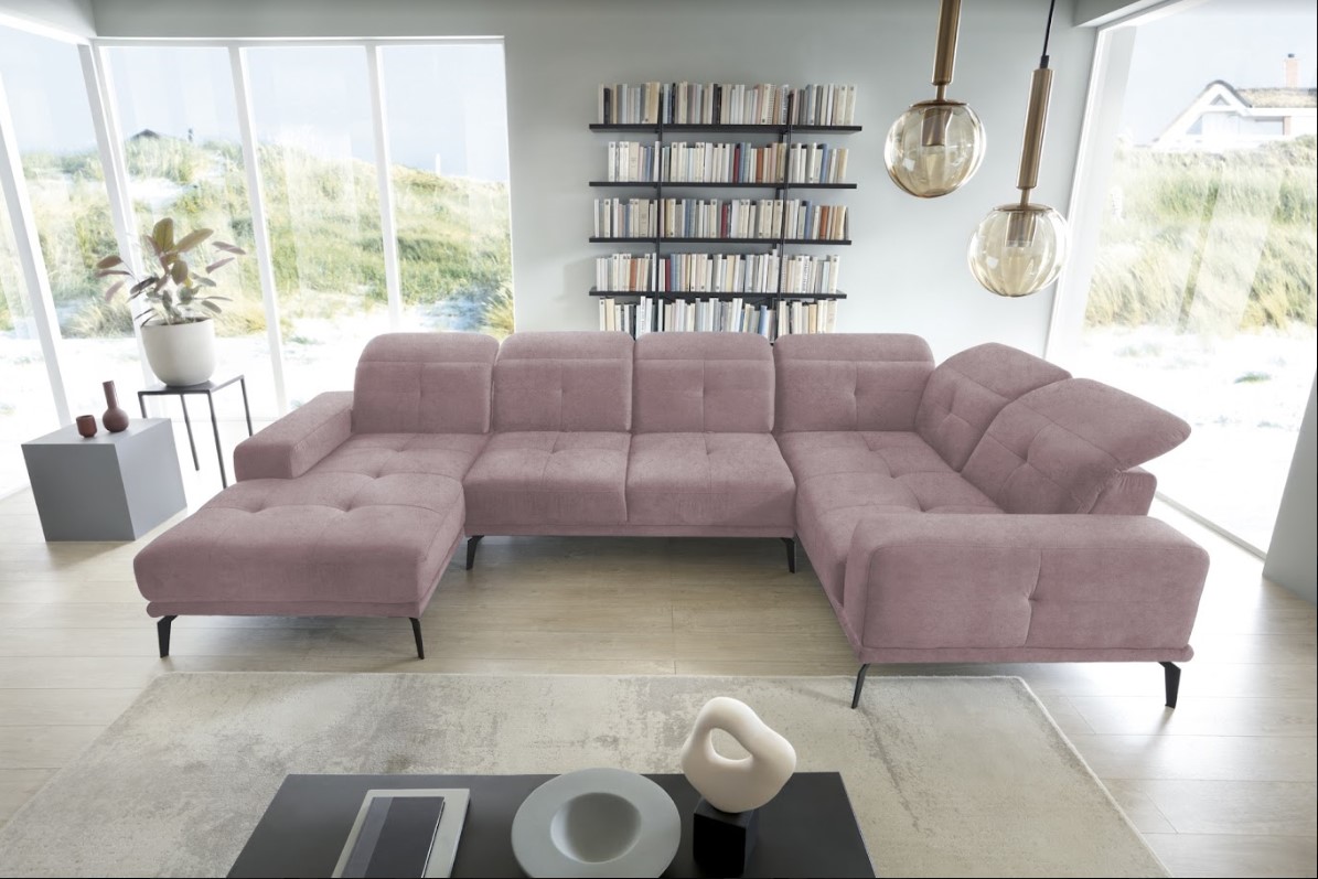 Vytvorte si z obývacej izby atraktívny priestor s dizajnovou sedacou súpravou v tvare U. Vďaka vysokým čiernym nohám pôsobí konštrukcia sedačky odľahčene, pričom však nestráca na stabilite. Mimoriadny dizajn dodáva pohovke ozdobné prešívanie na celej ploche sedenia a komfort užívania zvyšuje možnosť polohovania hlavovej opierky.  Vďaka čalúnenej zadnej strane je vhodná aj do priestoru. Spravte si z obývacej izby harmonický a zladený celok vďaka originálnej sedačke NEVIRO v pravom prevedení.