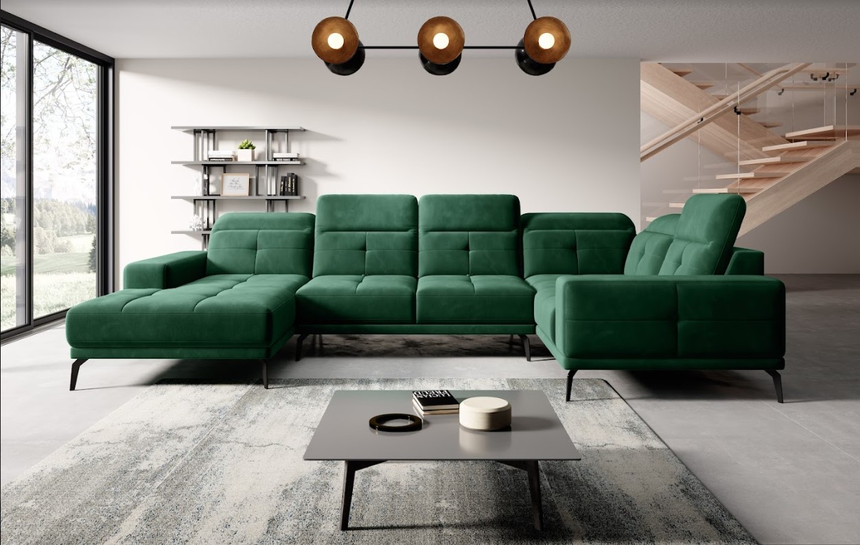 Vytvorte si z obývacej izby atraktívny priestor s dizajnovou sedacou súpravou v tvare U. Vďaka vysokým čiernym nohám pôsobí konštrukcia sedačky odľahčene, pričom však nestráca na stabilite. Mimoriadny dizajn dodáva pohovke ozdobné prešívanie na celej ploche sedenia a komfort užívania zvyšuje možnosť polohovania hlavovej opierky. Vďaka čalúnenej zadnej strane je vhodná aj do priestoru. Spravte si z obývacej izby harmonický a zladený celok vďaka originálnej sedačke NEVIRO v pravom prevedení.