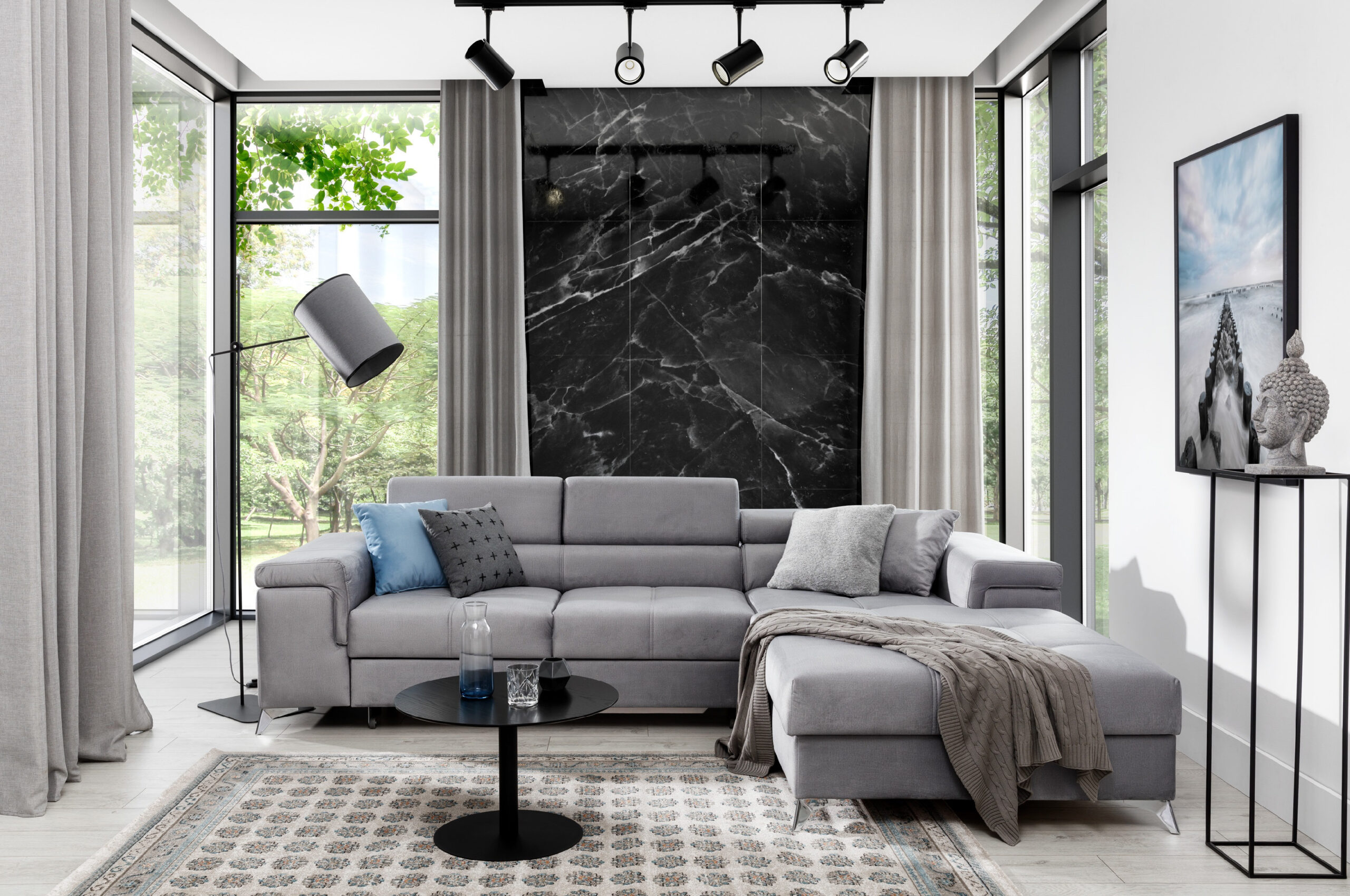 Moderná rohová sedačka RICARDO je vybavená rozkladacou funkciou na spanie, založenou na veľmi intuitívnom systéme delfín – vďaka ktorému bude ľahké získať miesto na spanie s rozlohou až 125 x 210 cm. Efekt mäkkosti a pružnosti je zabezpečený použitím kvalitnej peny a použitím vlnitých pružín, vďaka čomu dokonale plní svoju najdôležitejšiu úlohu: zabezpečuje pohodlný spánok a odpočinok.  Rohovú pohovku Ricardo sme pri navrhovaní vybavili funkciami, ktoré zaručujú maximálny komfort, ako sú široké, mierne zaoblené podrúčky alebo opierky hlavy vybavené funkciou nastavenia, vďaka ktorým sa pohodlne usadíte tak, ako sa vám najviac páči, a vaša chrbtica a chrbát si po celom dni oddýchne. Rohová sedačka Ricardo je dostupná v širokej škále farieb a kvalitných látok, vďaka čomu si každý náš zákazník nájde odtieň, ktorý dokonale ladí s jeho interiérom. Moderný tvar, jemne profilované podrúčky, bol prelomený štýlovým prešívaním. Štýl dodávajú nápadné chrómové nohy. Vďaka tomu sa sedacia súprava Ricardo  s moderným dizajnom,  hodí k súčasným interiérom: jednoduchá a zároveň štýlová, vďaka použitiu jemných, no premyslených dekorácií.
