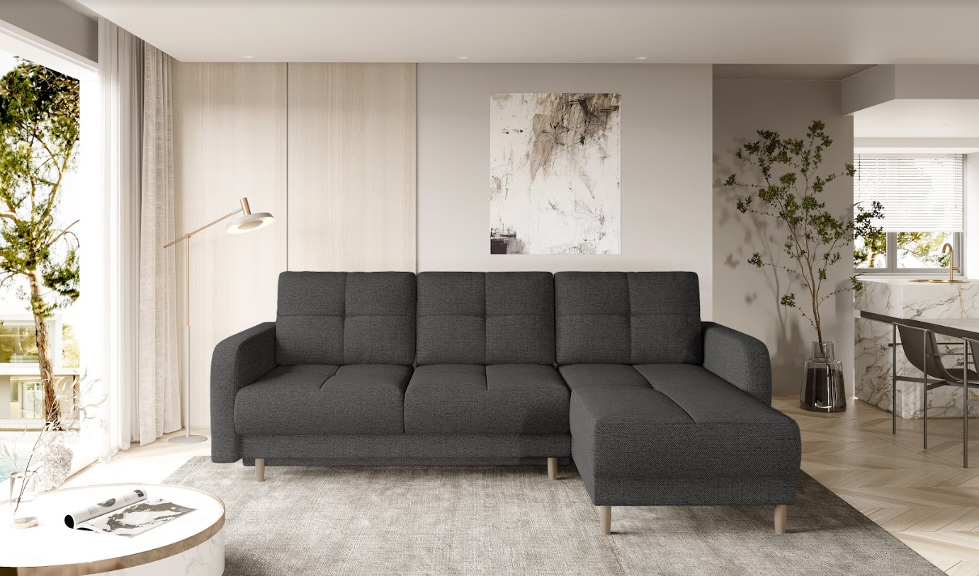 Vytvorte si z obývacej izby atraktívny priestor s dizajnovou rohovou sedacou súpravou ROXI. Mimoriadny dizajn dodáva pohovke pútavé prešívanie na sedení a operadle, vďaka čalúnenej zadnej strane je vhodná aj do priestoru. Oceníte vybavenie rozkladacou funkciou na spanie založenou na DL mechanizme – vďaka ktorému bude ľahké získať miesto na spanie s rozlohou až 120 x 215 cm. Spravte si z obývacej izby harmonický a zladený celok vďaka originálnej sedačke ROXI.