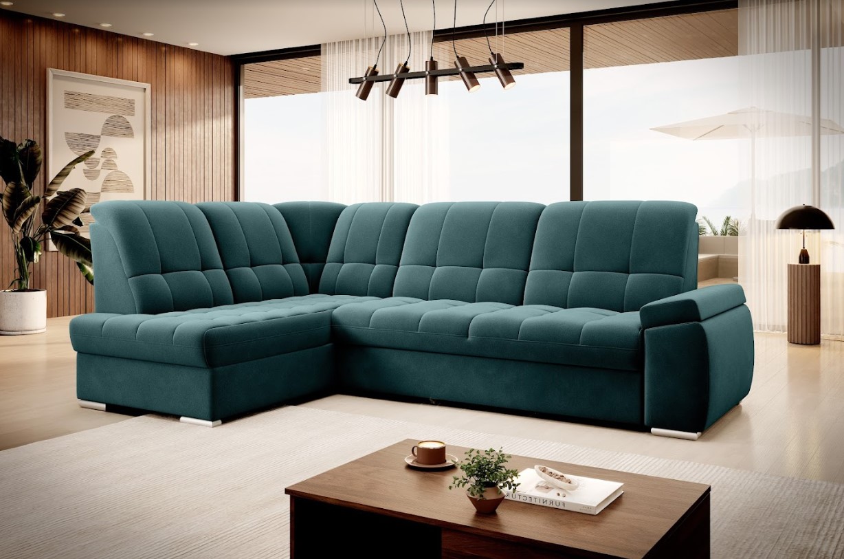 Vytvorte si z obývacej izby atraktívny priestor s dizajnovou rohovou sedacou súpravou SADO v ľavom prevedení. Mimoriadny dizajn dodáva pohovke pútavé prešitie a zaujímavé tvarovanie podrúčok, vďaka čalúnenej zadnej strane je vhodná aj do priestoru. Oceníte vybavenie rozkladacou funkciou na spanie, založenou na mechanizme deflín – vďaka ktorému bude ľahké získať miesto na spanie s rozlohou až 130 x 207 cm. Spravte si z obývacej izby harmonický a zladený celok vďaka originálnej sedacej súprave SADO.