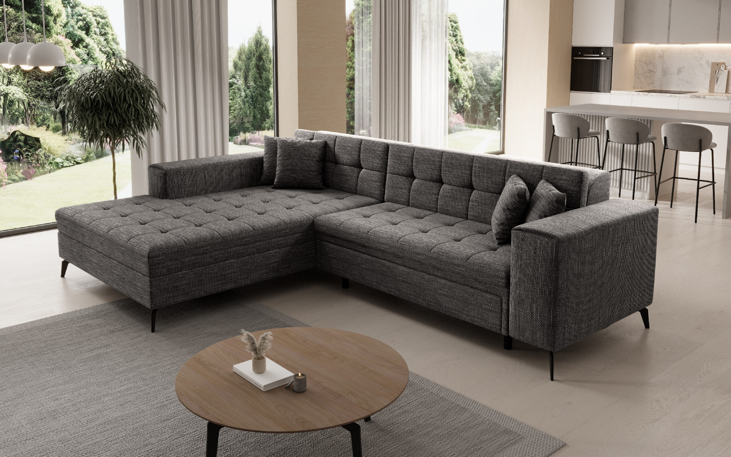 Moderné interiéry sa vyznačujú jednoduchosťou a eleganciou, rohová sedacia súprava SOLANGE sa do tohto štýlu dokonale hodí. Vďaka svojmu tradičnému a jednoduchému rozloženiu sa stane sedacia súprava Solange pravou dominantou obývacej izby. Priestranné sedenie, vhodne tvarované operadlo, jemne zaoblené opierky – to všetko dotvára estetiku sedacej súpravy. Štýlové vysoké nohy a jemné prešívanie umiestnené na celom povrchu operadla a sedadla zvyšujú vizuálny zážitok. Sedacia súprava je rozkladacia so spacou plochou o rozmere 210 x 126cm. Je vhodná aj do priestoru, nakoľko je čalúnená aj zo zadnej strany.