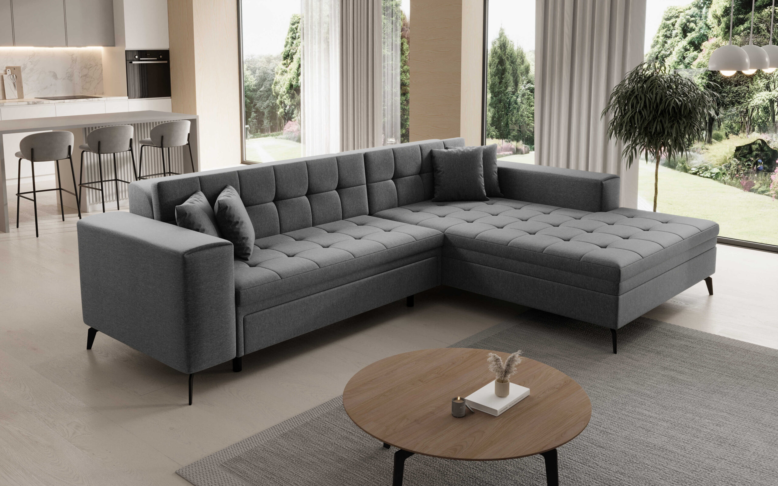 Moderné interiéry sa vyznačujú jednoduchosťou a eleganciou, rohová sedacia súprava SOLANGE sa do tohto štýlu dokonale hodí. Vďaka svojmu tradičnému a jednoduchému rozloženiu sa stane sedacia súprava Solange pravou dominantou obývacej izby. Priestranné sedenie, vhodne tvarované operadlo, jemne zaoblené opierky – to všetko dotvára estetiku sedacej súpravy. Štýlové vysoké nohy a jemné prešívanie umiestnené na celom povrchu operadla a sedadla zvyšujú vizuálny zážitok. Sedacia súprava je rozkladacia so spacou plochou o rozmere 210 x 126cm. Je vhodná aj do priestoru, nakoľko je čalúnená aj zo zadnej strany.