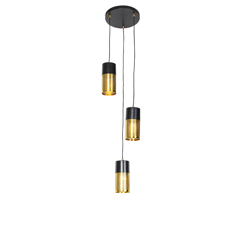 Industriálne závesné svietidlo čierne so zlatým okrúhlym 3-svetlom – Raspi