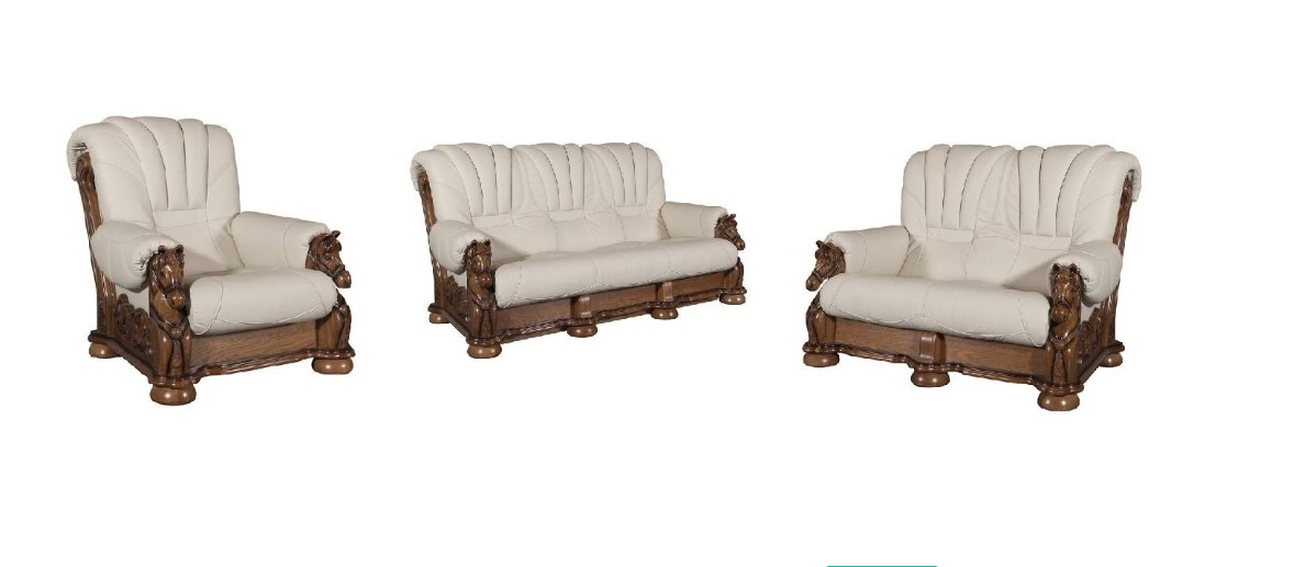 Luxusná kožená sedacia súprava MUSTANG ponúka starodávny štýl s romantickým nádychom. Sedacia súprava sa vyznačuje dokonale vyrezávanými ornamentmi v dreve po bokoch sedačky. Na opierkach sedacej súpravy sú vyrezávané konské hlavy, ktoré sú jedinečnými umeleckými dielami. Táto neprehliadnuteľná sedacia súprava bude dominantným prvkom v každej domácnosti milovníkov klasiky. Celkový šmrnc dodávajú sedacej súprave mohutné vyrezávané nohy. Na výber je niekoľko druhov kože. Pri objednávke prosím uveďte požadovanú farebnú variantu v poznámke. Uvedená cena platí pre základnú cenovú skupinu, pričom sa môže líšiť v závislosti od výberu kože. Cena sedacej zostavy MUSTANG 3R+2+1 zahŕňa 3-sed s rozkladom
